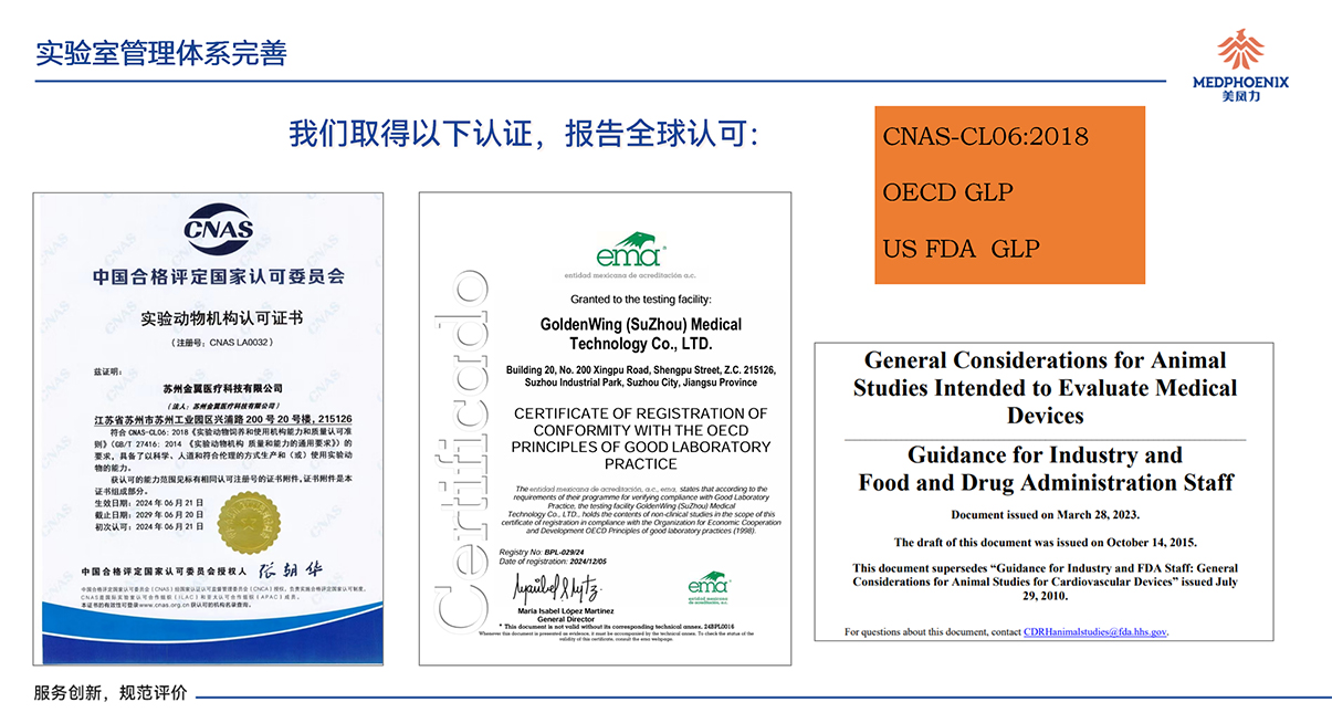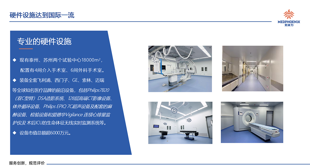 美鳳力擁有泰州 13000m2以及蘇州 5000㎡ 實(shí)驗(yàn)室,著力打造成為全球領(lǐng)先的創(chuàng)新醫(yī)療器械一站式綜合服務(wù)平臺(tái)。美鳳力擁有多個(gè)DSA 雜交手術(shù)室、移植手術(shù)室、外科手術(shù)室、ICU 監(jiān)護(hù)室,腔鏡培訓(xùn)中心、手術(shù)機(jī)器人培訓(xùn)中心、檢驗(yàn)中心及病理中心,配備全球最頂級心臟電生理系統(tǒng)、DSA 造影系統(tǒng)、影像設(shè)備、麻醉設(shè)備、檢驗(yàn)設(shè)備。同時(shí),實(shí)驗(yàn)室建立了符合 CNAS 的 GLP、OECD 的 GLP 以及美國FDA《General Considerations for Animal Studies Intended to Evaluate Medical Devices》要求的 GLP,規(guī)范實(shí)驗(yàn)管理,確保實(shí)驗(yàn)質(zhì)量,滿足客戶的不同需求。