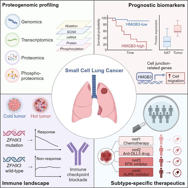 該研究對小細(xì)胞肺癌患者的腫瘤組織和配對癌旁組織樣本進(jìn)行了蛋白基因組學(xué)(proteogenomics)分析,通過整合基因組、轉(zhuǎn)錄組、蛋白質(zhì)組、磷酸化蛋白質(zhì)組等多維組學(xué)數(shù)據(jù),系統(tǒng)揭示了小細(xì)胞肺癌的分子特征,提出新的分子分型及其針對性的個體化治療策略,為深入理解小細(xì)胞肺癌的發(fā)病機(jī)制和改善臨床治療策略奠定了堅實的基礎(chǔ)。