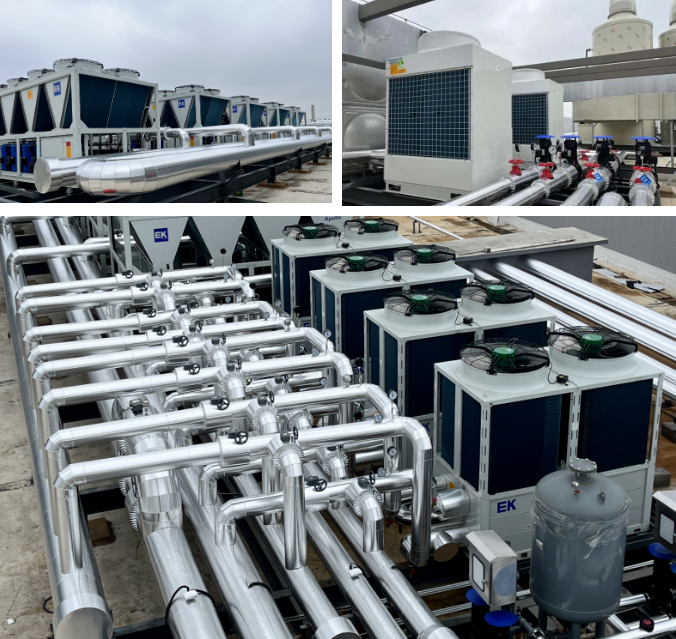在本項目中,EK為美鳳力配備了5臺EKAC1600大渦旋機(jī)組、4臺EKAC四管制恒溫恒濕機(jī)組以及2臺EKAH120低溫空氣源熱泵熱水機(jī)組。所有設(shè)備均安裝于屋頂,無需設(shè)置專用機(jī)房,既節(jié)省了地面資源,又不影響建筑物美觀。