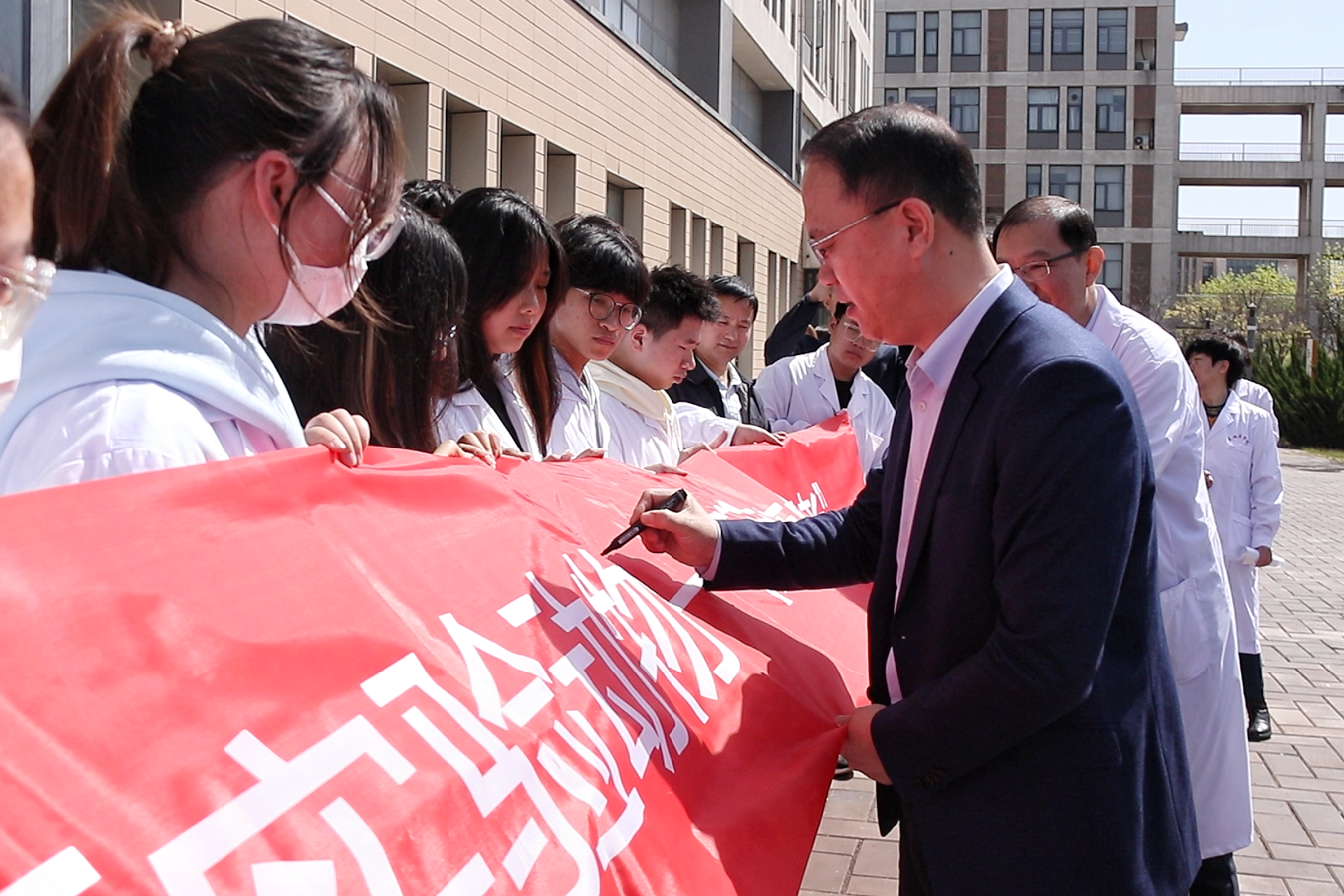教師代表楊秀紅、學生代表任佳慧分別進行了發(fā)言。田煒帶領全體師生進行醫(yī)學人文宣誓并向為人類科學發(fā)展貢獻出寶貴生命的實驗動物集體默哀。最后全體師生向實驗動物慰靈碑敬獻花束,并在“關愛實驗動物-做有溫度的醫(yī)者”條幅上簽名助力,合影留念。
