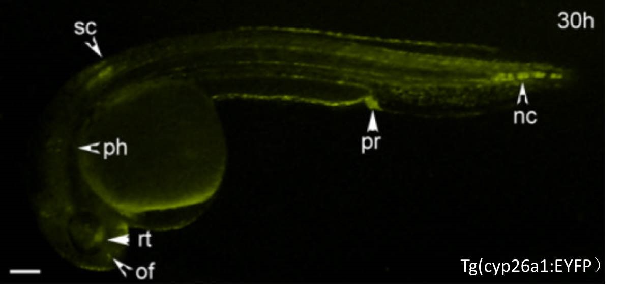 CZ224(nju1Tg, Tg(cyp26a1:EYFP))轉基因品系由cyp26a1基因一段2.5kb的啟動子驅動EYFP標記基因的表達,表達部位主要分布在視網膜、嗅球、背側脊髓前部、后腸、脊索后部和咽弓等組織中(Hu et al., 2008)。cyp26a1基因是細胞色素P450家族成員,相對應的產物為Cyp26氧化酶,可以和視黃醛脫氫酶RALDHs(aldh1a2基因產物)共同協(xié)調維持視黃酸(RA)的均衡狀態(tài)。視黃酸參與了細胞增殖和凋亡、細胞分化和組織形態(tài)等多個重要的生理功能中,對機體的視覺、皮膚、免疫、生殖和神經系統(tǒng)等都有一定的影響。