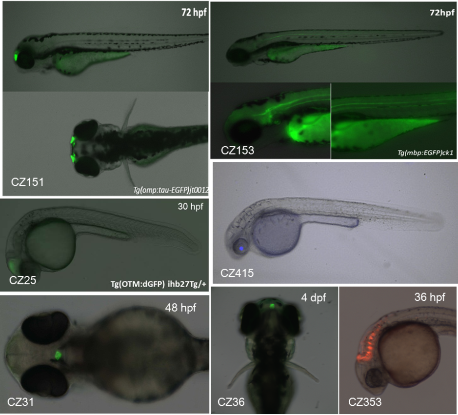 對特異單一神經相關組織感興趣的朋友可以關注CZ25(Tg(OTM:dGFP) ihb27Tg,標記中腦組織),CZ31(Tg(-1.0pomca:GFP) zf44Tg,標記腦垂體),CZ36(Tg(-2.5tshb:EGFP) ihb5Tg,標記松果體),CZ151(Tg(ompb:tau-eGFP) jt0012Tg,標記嗅球),CZ153(Tg(mbp:EGFP) ck1Tg,標記成髓鞘膠質細胞),CZ353(Tg(atoh1a:dTomato)nns8Tg,標記小腦組織)和CZ415(Tg(crybb1:CFP) tsu24Tg,標記晶狀體)等品系。