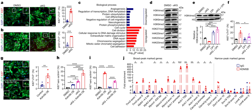 在進一步的研究中,這些作者成功破譯背后的內(nèi)在機制。Braun解釋說,“在基因失活的小鼠心肌細胞中,我們發(fā)現(xiàn)α-酮戊二酸的水平增加了20倍。高水平的這種代謝物導致 KDM5 酶的活性顯著增加?!?/p>