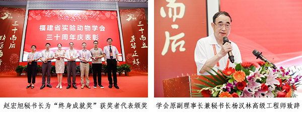 為弘揚科技工作者對福建省實驗動物科學的建設與發(fā)展所做出的貢獻,銘記功績、激勵后人,在新時期進一步推動我省實驗動物科學的持續(xù)發(fā)展,學會在成立 30 周年之際設立福建省實驗動物科學“終身成就獎”、“杰出貢獻獎”和“積極貢獻獎”。中國實驗動物學會趙宏旭秘書長、科技廳基礎處曾紅月三級調(diào)研員、省實驗動物學會鄭和平理事長分別為以上獲獎人員頒發(fā)了獎杯和證書。