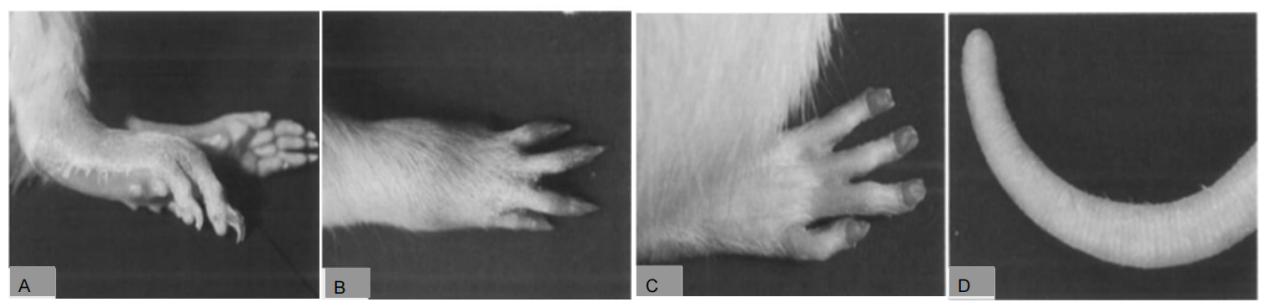 圖C 指甲角化過度 圖D 尾部皮膚銀屑病樣