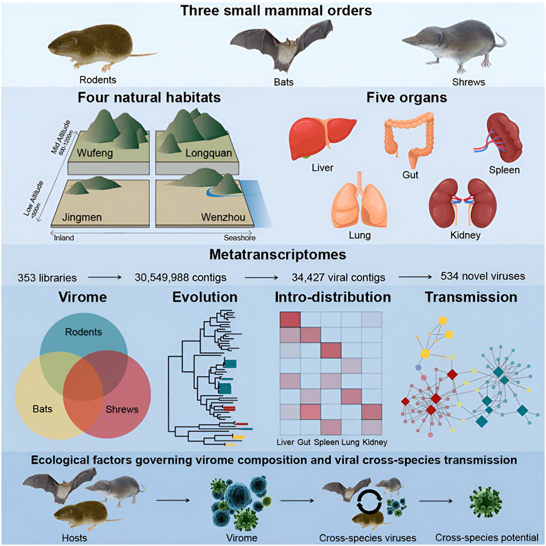 在一項新的研究中,來自中國復旦大學、龍泉市疾病預防控制中心、武漢市疾病預防控制中心和溫州市疾病預防控制中心等研究機構的研究人員探究了毛茸茸的小型病毒載體如何影響病毒的傳播和進化。他們報告了669種病毒的鑒定結(jié)果,其中包括534種新型病毒,大大擴展了人們對哺乳動物病毒組(mammalian virome)---包括以前未知的冠狀病毒和正腮腺炎病毒(orthorubulavirus)---的了解。相關研究結(jié)果發(fā)表在2023年10月12日的Cell期刊上,論文標題為“Host traits shape virome composition and virus transmission in wild small mammals”。