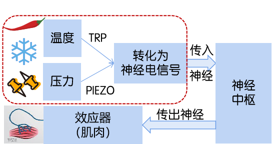 溫度、壓力等外界信息通過TRP或PIEZO等受體轉(zhuǎn)化為神經(jīng)電信號,通過傳入神經(jīng)抵達神經(jīng)中樞并沿產(chǎn)出神經(jīng)調(diào)節(jié)效應(yīng)器,形成反射弧,對外環(huán)境產(chǎn)生反應(yīng)和適應(yīng)。紅色虛線內(nèi)為2021年諾貝爾生理學(xué)或醫(yī)學(xué)獎的相關(guān)內(nèi)容。