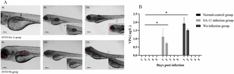 5 dpf 斑馬魚(yú)仔魚(yú) RV 感染指標(biāo):活體成像:5 dpf 仔魚(yú)感染熒光標(biāo)記的 RV SYTO-SA-11 和 SYTO-Wa株。SYTO-SA-11感染4 h后,紅色熒光逐漸在腸道內(nèi)積聚。 感染6 h后,熒光在仔魚(yú)腸道頂部和腦內(nèi)積聚,10 h后在腦內(nèi)逐漸增強(qiáng)。感染14 h后,腸內(nèi)熒光逐漸減弱,腦內(nèi)熒光持續(xù)增強(qiáng)。同樣,感染4 h后在腸道和大腦中也觀(guān)察到紅色熒光SYTO-Wa感染的仔魚(yú),然后在感染10 h和12 h后主要轉(zhuǎn)移并積聚到大腦中。