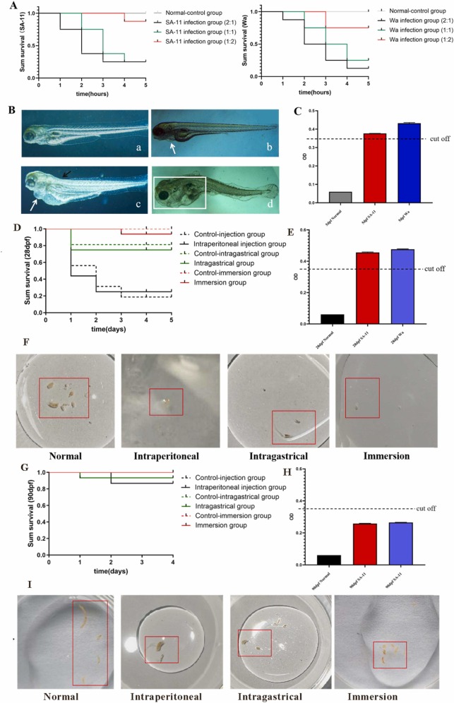 圖 2. 感染條件的篩選。 5 dpf仔魚(yú)感染條件篩選結(jié)果如圖A-C所示。(A:SA-11和Wa株感染5dpf仔魚(yú)的存活曲線(xiàn)。B:5dpf仔魚(yú)感染后的病變C:SA-11和Wa株1:2感染組5dpf仔魚(yú)中抗原VP6的ELISA檢測(cè))。28 dpf仔魚(yú)感染情況篩選結(jié)果見(jiàn)D-F。