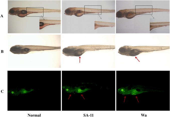 中性粒細(xì)胞、巨噬細(xì)胞和凋亡細(xì)胞的觀(guān)察:SA-11株和Wa株感染5dpf仔魚(yú)24 h后,體內(nèi)巨噬細(xì)胞和中性粒細(xì)胞的聚集情況如圖5A和B所示。正常組的巨噬細(xì)胞和中性粒細(xì)胞主要集中在仔魚(yú)的大腦和血液島中。與正常組相比,SA-11株感染組和Wa株感染組巨噬細(xì)胞在腸道和肛門(mén)周?chē)忻黠@聚集,感染組中性粒細(xì)胞在腸道周?chē)忻黠@聚集。SA-11株和Wa株感染5dpf仔魚(yú)24h后吖啶橙染色結(jié)果如圖5C所示。與正常組相比,SA-11感染組和Wa感染組腸道周?chē)梢?jiàn)明顯的黃綠色熒光,提示細(xì)胞凋亡。