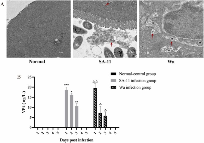 圖7.A:透射電鏡觀(guān)察28dpf仔魚(yú)感染SA-11株和Wa株的腸道。7B:28dpf仔魚(yú)中抗原VP4的表達(dá)。