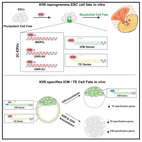 Klf5對雙電位細(xì)胞命運至關(guān)重要; 一個Klf5過表達(dá)的胚胎干細(xì)胞(ESC)在嵌合胚胎中產(chǎn)生終末分化的胚胎和胚胎外系,Klf5直接誘導(dǎo)內(nèi)細(xì)胞質(zhì)量(ICM)和滋養(yǎng)胚層(TE)規(guī)范基因。有趣的是,Klf5和Klf4在ICM規(guī)范中冗余地發(fā)揮作用,而僅Klf5缺陷就會損害TE規(guī)范。Klf5受到多個2c特異性轉(zhuǎn)錄因子的調(diào)控,尤其是Dux,并且Dux/Klf5軸是進化保守的。2c特異性轉(zhuǎn)錄程序與Klf5匯合,建立雙電位細(xì)胞命運,使ICM和TE基因雙重激活的細(xì)胞狀態(tài)。